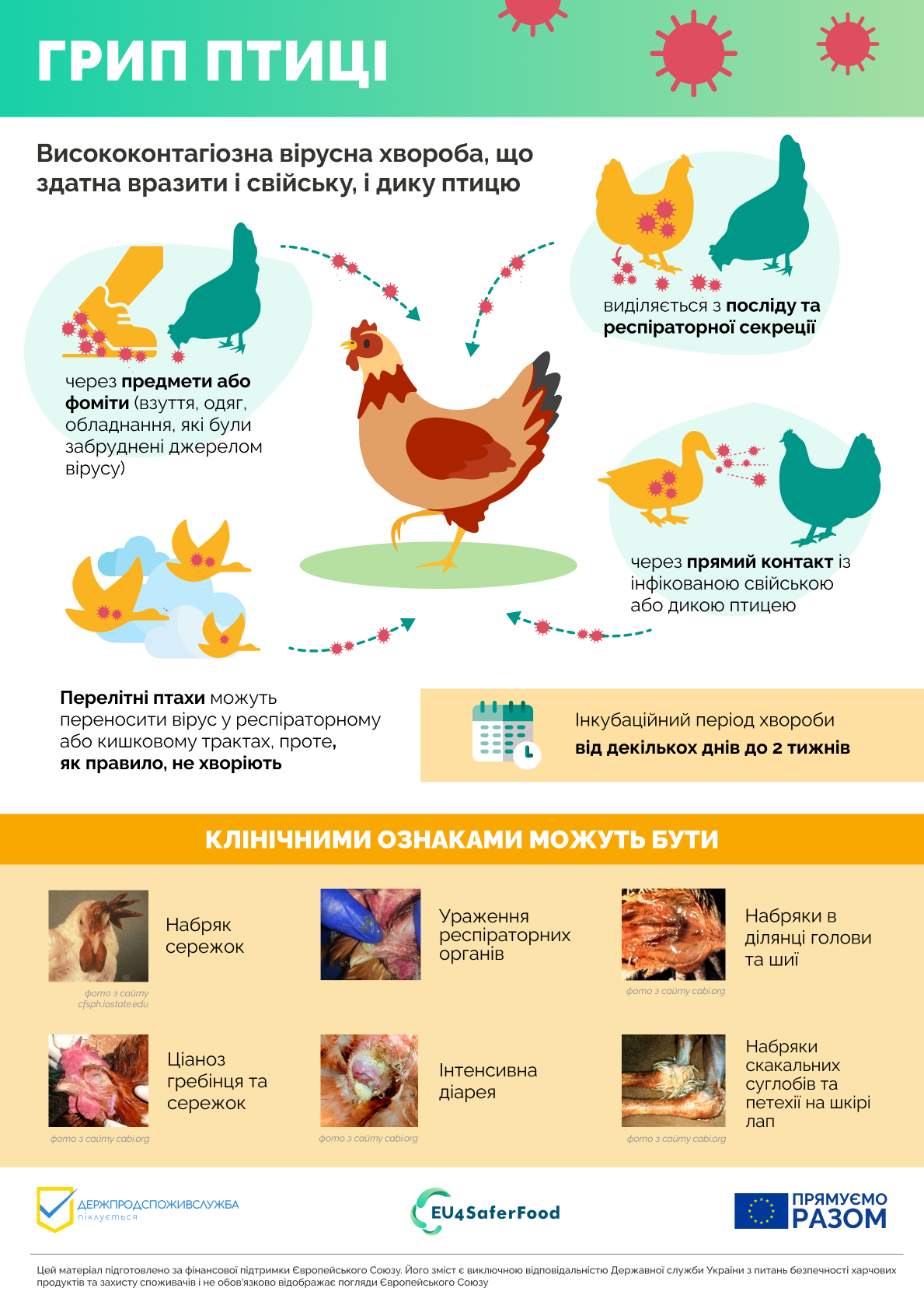 Пташиний грип передається домашній птиці від диких птахів, у яких захворювання може протікати безсимптомно, тому для уникнення зараження поголів’я ВПГП як в комерційних, так і в особистих селянських господарствах варто дотримуватись заходів біобезпеки.